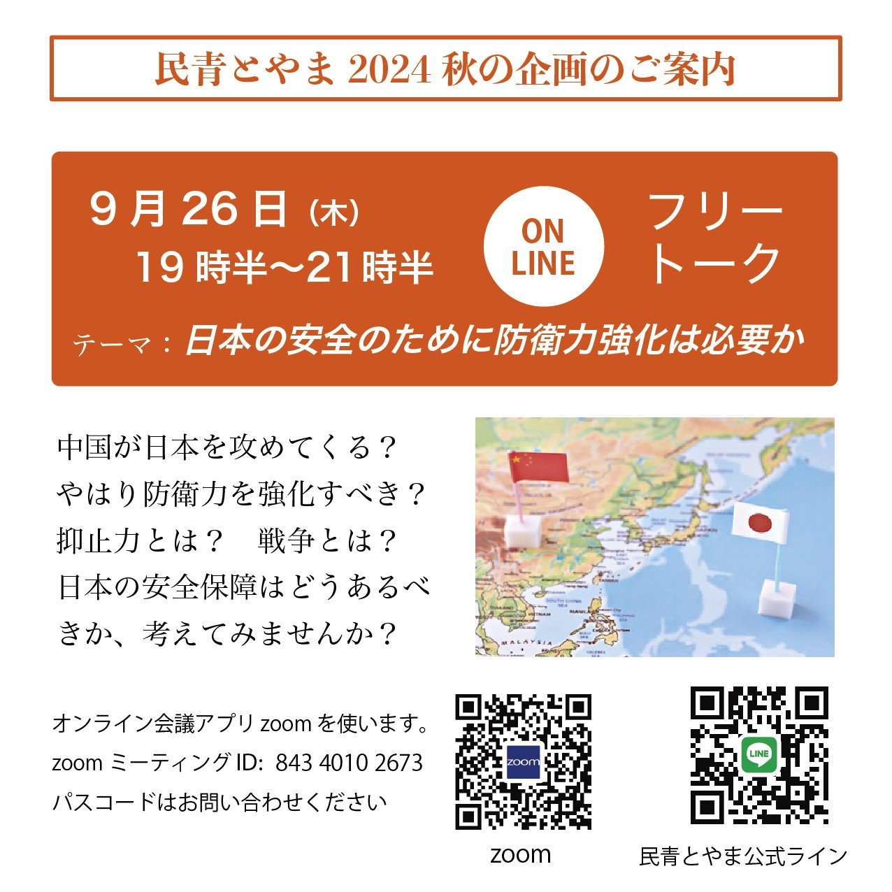 日本民主青年同盟富山県委員会(民青とやま)は、9月26日、『日本の安全のために防衛力強化は必要か』をテーマに学習会を行いました。坂本ひろし衆院富山3区予定候補も参加しました。