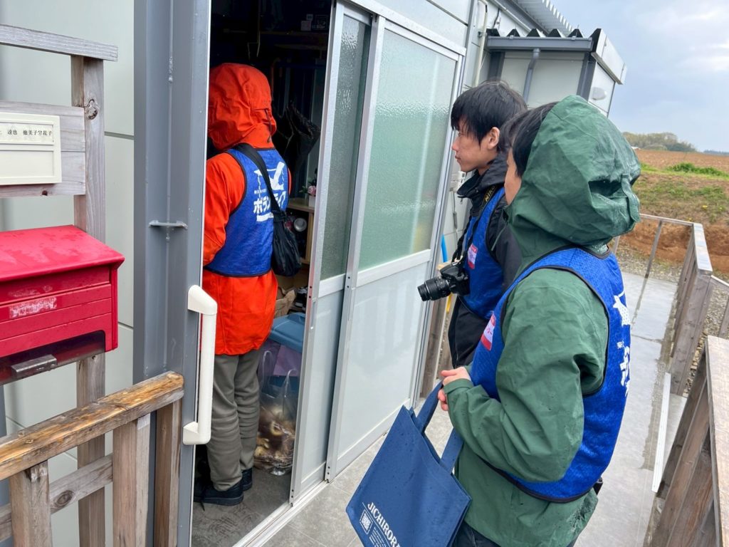 参加者は、能登町白丸地区の仮設住宅で入居者にお米と水を渡し、お困りごとや行政への要望の聞き取り調査を行いました。子どもが金沢市に住んでいるなどの理由で1人暮らしの入居者が多く、「若い方が富山から来て話してくれるだけでうれしい」と、参加した同盟員や学生と、積極的な交流を行いました。