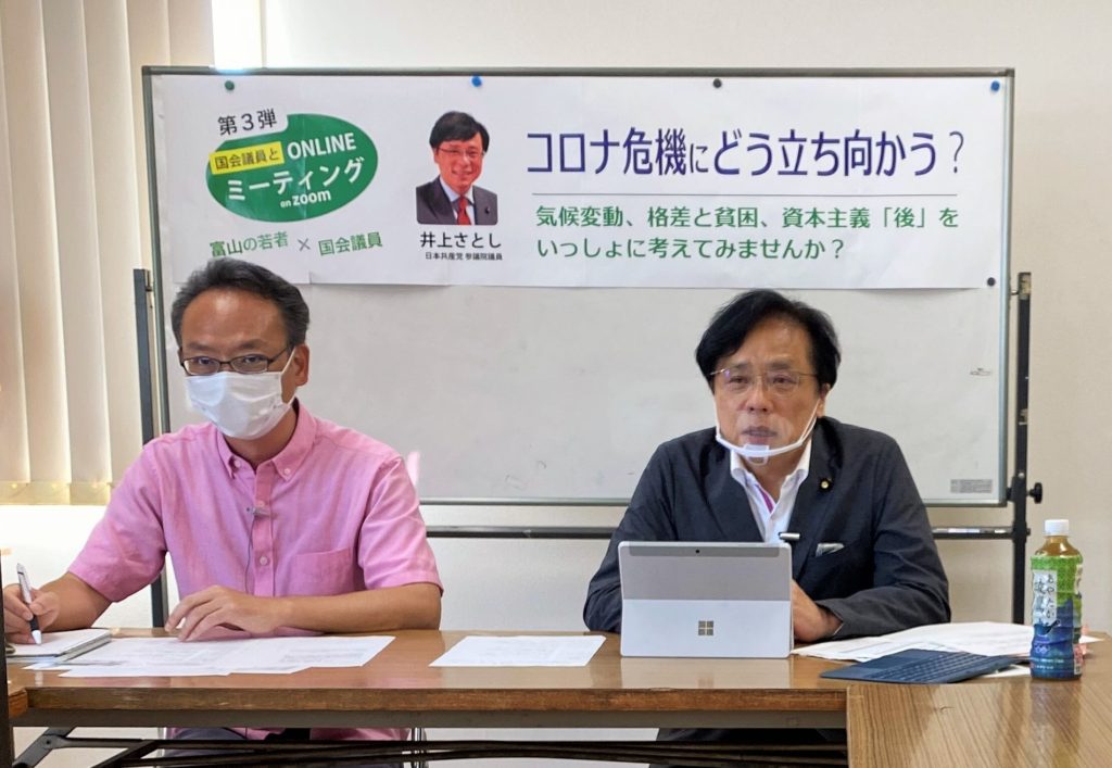 日本共産党の井上哲士参院議員を迎えてのオンラインミーティング第3弾が8月30日行われました。学生や社会人など15人が参加。民医連では会場を設定して、6人が参加しました。