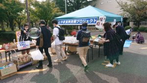 前日までの肌寒い天気から一転して、気持ちのいい秋晴れの天気に恵まれた10月18日(日)、「学生応援!食糧支援プロジェクト」を、五福公園の一角で開催。11時の開始をめざして、9:30から準備を開始。長机やテントも準備しながら、前日に各自の車に積み込んだ物資などを並べ、看板やプラカードなどの宣伝物も設置。