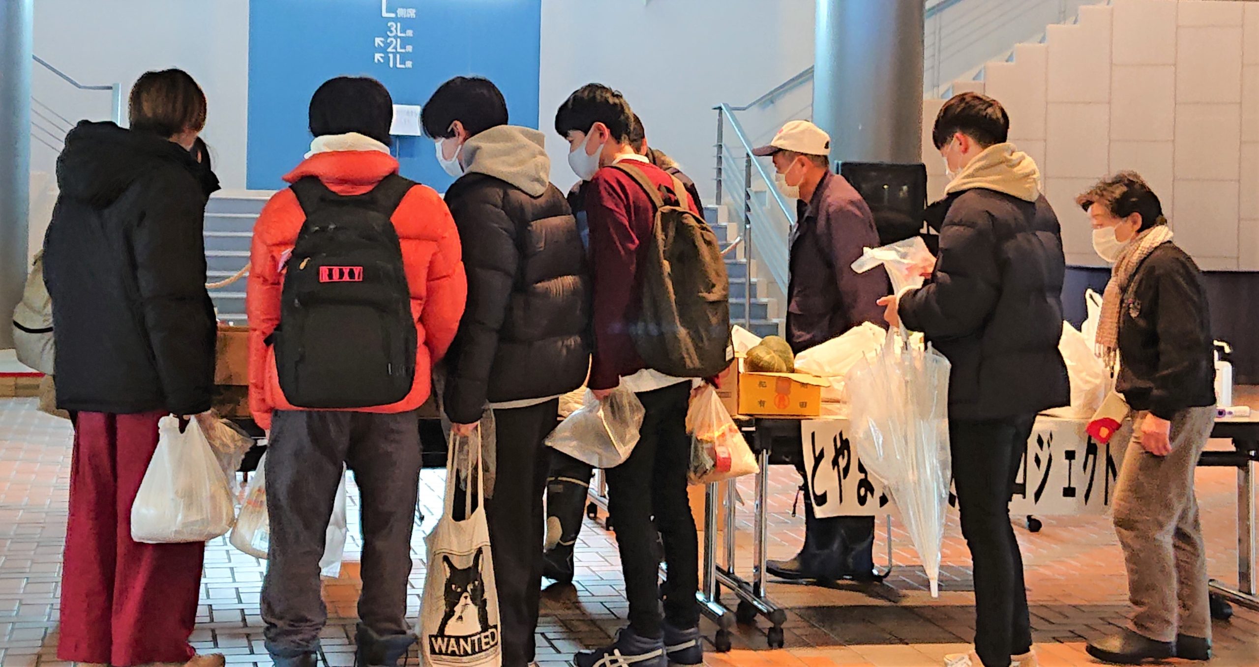1月23日に射水市のラポールで取り組んだ「富山学生支援プロジェクト」(日本共産党呉西地区委員会・応援)には、県立大学の学生さんを含め、53人が来場しておコメや野菜、レトルト食品などを受け取りました。