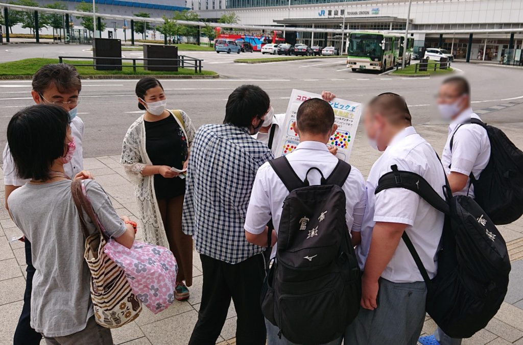 民青とやまは13日、日本共産党富山県委員会と同富山地区委員会のみなさんと、富山駅前でシールアンケート宣伝に取り組みました。