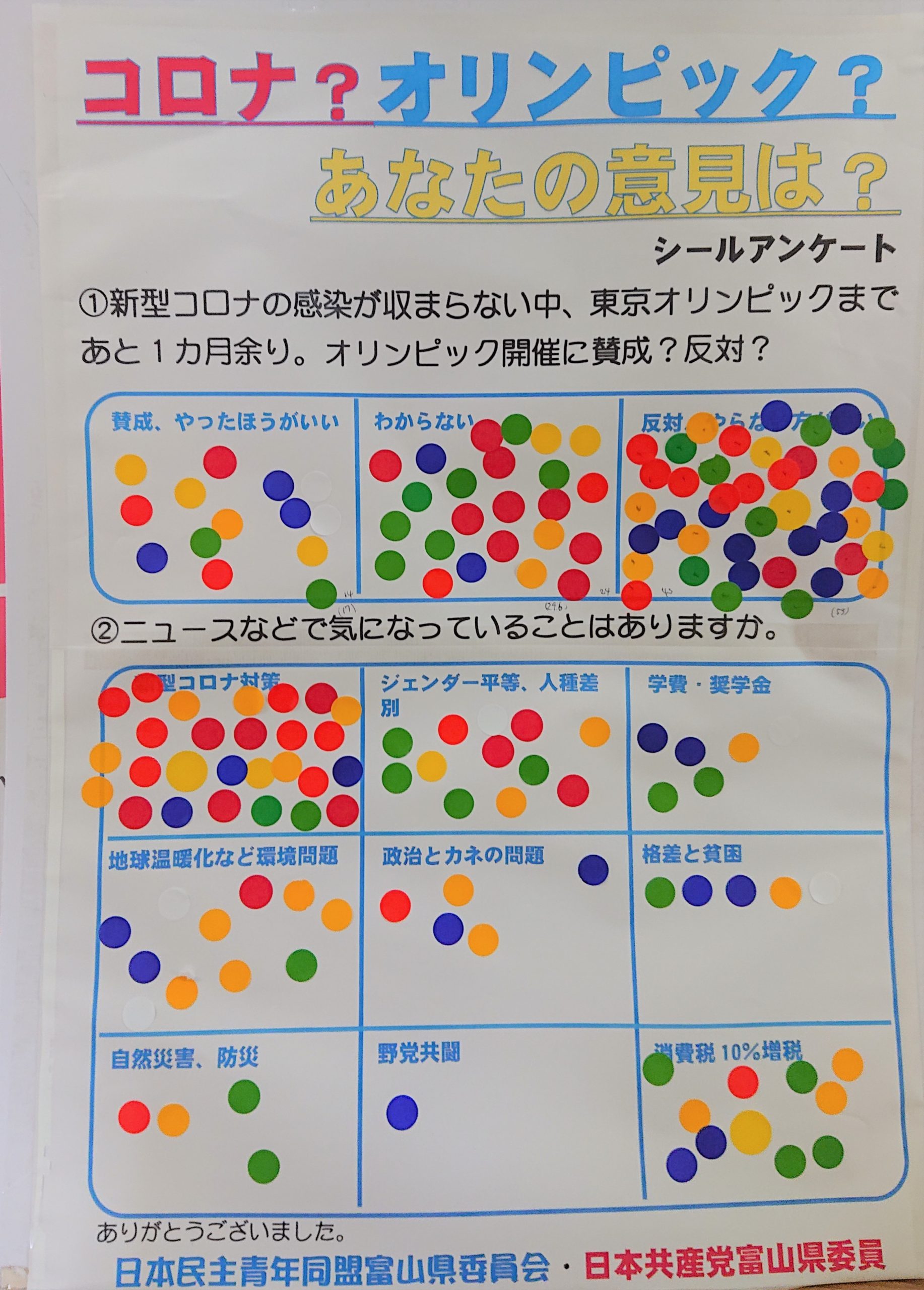 質問の項目は、「オリンピック開催に”賛成”か”反対”か」を聞くものと、社会問題で関心ある項目を聞くものの2種類。約1時間の取り組みで、81人がアンケートに答えました。