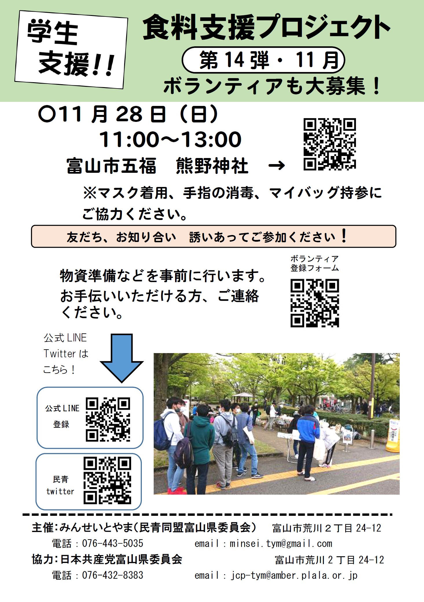 11月の食料支援を、今度の日曜日、28日、11:00から行います。会場は富山市五福の熊野神社(https://goo.gl/maps/QSbotP1WJBc7Jjqs9) で13:00までの予定です。