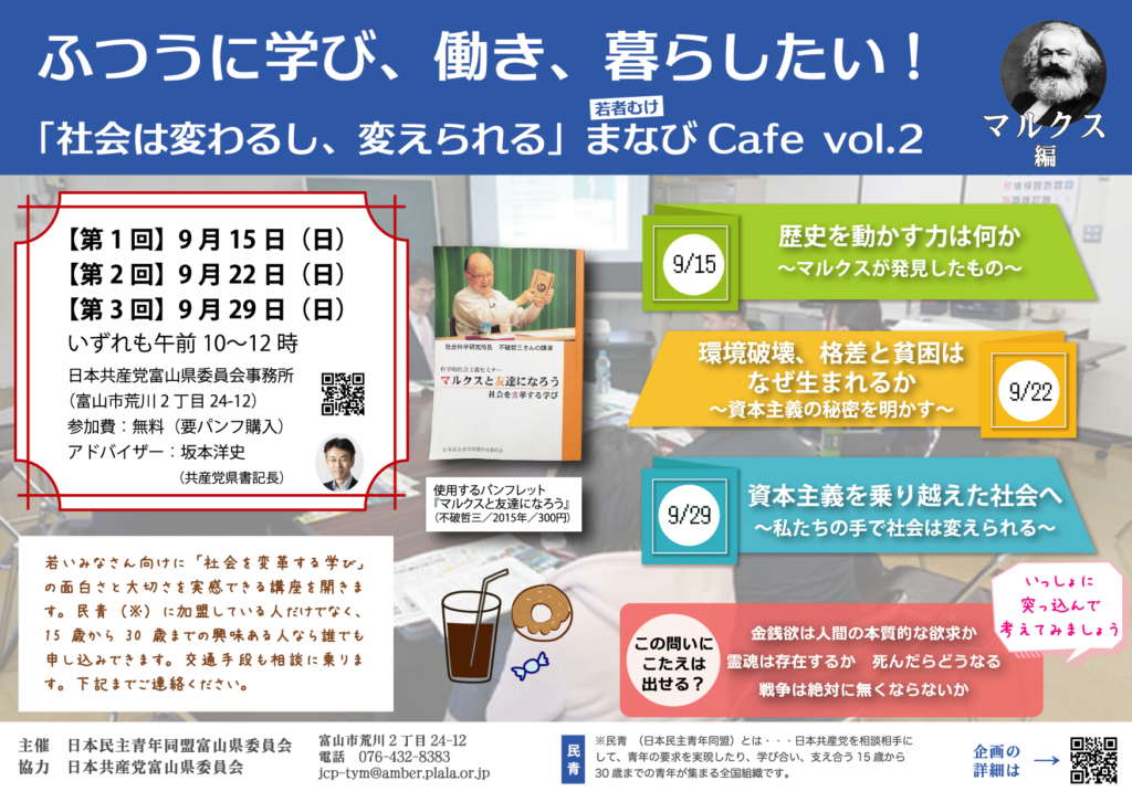 民青の夏の学習講座「まなびcafe」のマルクス編(計3回)が、9月29日終了しました。講師は、日本共産党富山県委員会の坂本洋史書記長でした。テキストは、『マルクスと友達になろう』(2015年)パンフです。