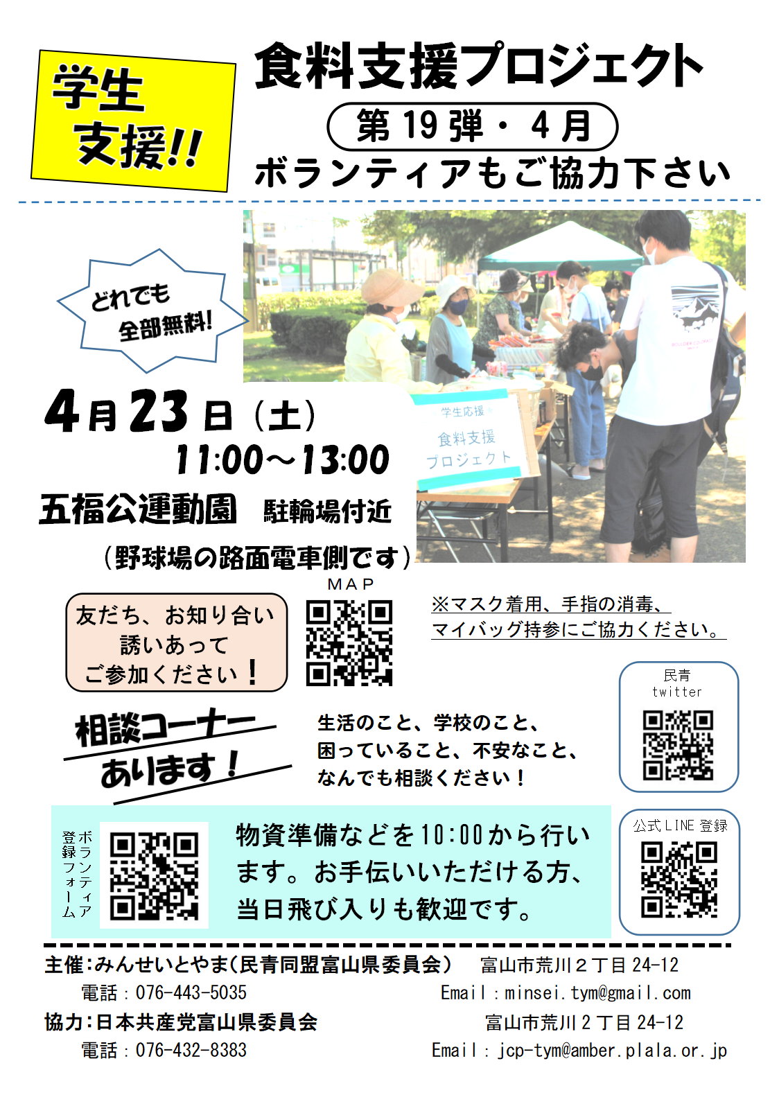 設営や物資の準備で、ボランティアを大募集。当日は10:00から、事前準備も計画中です。詳しくは、民青公式LINEやtwitterで案内します。