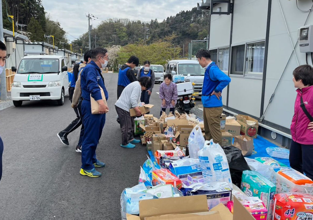 レクチャーの後、輪島市内の2箇所の仮設住宅を訪れ、トラックに積んだコメや飲料水、生活用品などを広げ、こらられる方々にお渡ししました。