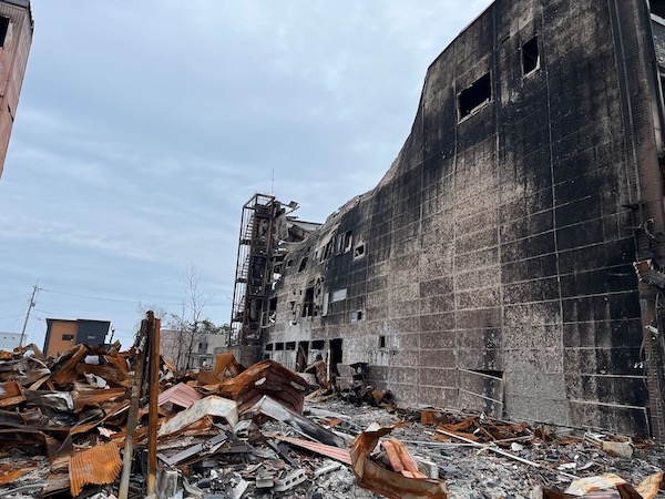 燃え方があまりに激しく、自動車のフロントガラスが溶けている様子もみえました。あぶみ史朗(鎧しろう/日本共産党)輪島市議会議員さんから、最初にお聞きしたお話で、金庫にいれていたお札が燃え尽きたというのは、この様子をみて納得しました。