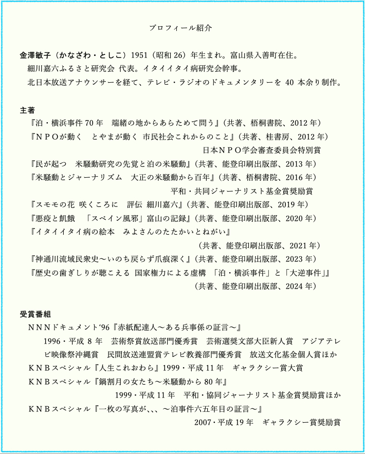 金澤さんには、当日、イタイイタイ病発生の背景、公害発生の原因究明にむけた住民や科学者・弁護士、県内の労働運動や市民運動のたたかい、そして患者さんやご家族、流域住民たちの苦悩などをお話しいただきます。患者さんであった小松みよさんに焦点をあてたお話が聞けます。貴重な体験を聴くことが出来ると思います。