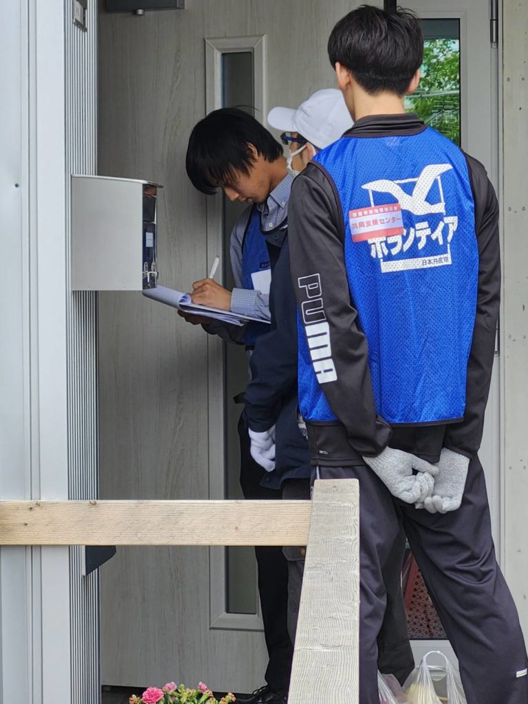 仮設住宅では、トラックに積んだコメや飲料水、生活用品などをお渡しするだけではなく、お困りごとや、行政に対する要望などをお聞きしました。参加者で二人一組の組を作り、最小限の物資を持って、一軒一軒お訪ねしました。