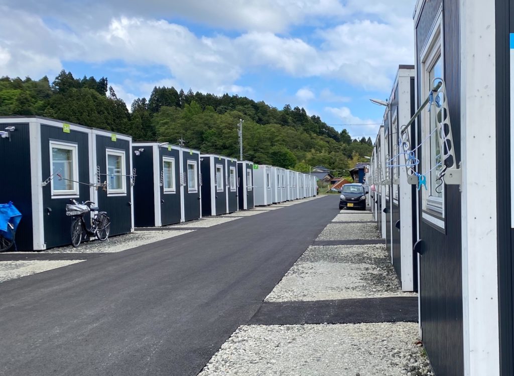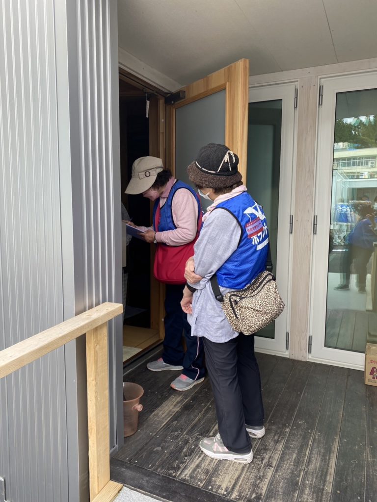 被災者の方々からは、「水・光熱費が高い」「2年でここを出なければいけない、あてがない」「台所がIHなので魚が焼けない」といった実情を伺いました。ある高齢のおばあさんに、追加で必要な物資があれば集会所まで取りに来てくださいと伝えたら、歩けないので難しいと言われました。そこで、私たちで改めておばあさんの部屋までお届けする場面もありました。翌日同所で行われるイベントで使うテント張り作業に人手が足りないとのことでしたので、私たちもお手伝いしました。そこではお茶会が行われるそうです。
