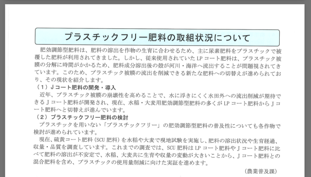 結局こうしたものは、国や行政がプラスチック被膜肥料を完全禁止にするなどの措置をとらないといけません。