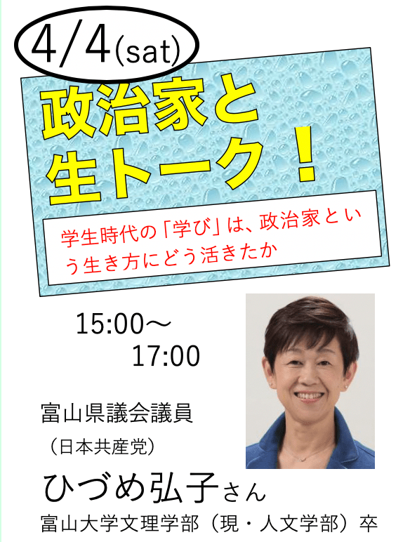4月4日(土)午後3時〜5時ごろ、喫茶パーク(富山市五艘1430-2、富山大学から徒歩7分、URL参照)にて。学生さんは入場・参加費無料です。マスク・アルコール・座席の間隔など新型コロナ対策は万全にし、人数制限を10名未満としていますので、安心してご参加ください。