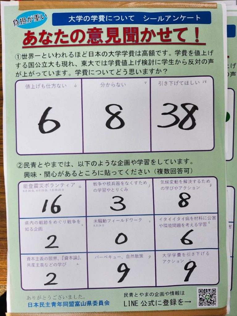 民青の企画で参加してみたいものを訊ねると、やはり能登半島復興ボランティアにシールを貼られる方の多いこと。皆能登の実情に心を痛めており、輪島市出身の学生を含め、何人もの学生が「何かしたい」と話してくれました。