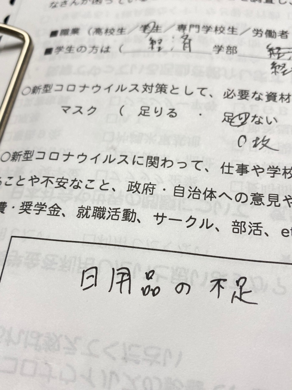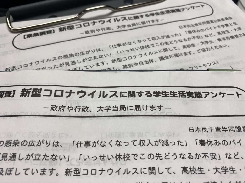 富山大学では、2日から新入生のオリエンテーションが始まりました。民青とやまでは新入生の皆さんにインタビューをし、新型コロナウィルス感染拡大に関する影響や実態、心配事などをお聞きしました。30名の方に回答いただきました。「マスクは1枚ももっていません。店には売ってないし!」「当面の枚数はあるけど、1〜2週間分くらいまでなので、やっぱり不安」などの回答がありました。県外から昨日、あるいは数日前に引っ越して来たばかりという学生が多く、実家から持参してきたマスクが底を尽きるのは時間の問題のようでした。
